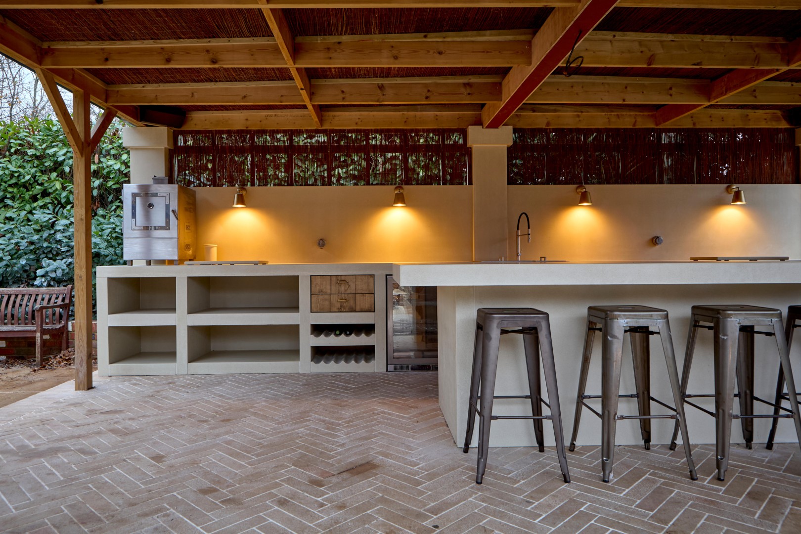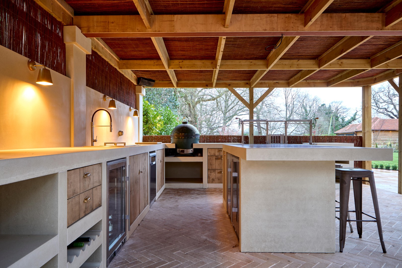 Concrete plays a defining role in this space. Its strength allows for generous work surfaces and integrated elements, while its understated texture brings a sense of permanence that feels grounded rather than imposing. In an outdoor environment, concrete responds naturally to light and weather, developing character over time rather than showing wear, an important consideration for spaces designed to be used frequently and lived in fully.